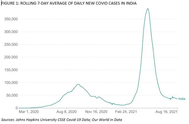 India saw a surge in the daily Covid-19 case load beginning in March 2021, peaking in mid-May at almost 400,000 cases, and rapidly dropping off thereafter. By the end of June, the number of new daily infections on a rolling 7-day average in India had fallen dramatically to under 50,000 cases and have more gradually decreased down to 36,874 as of August 14, 2021. The underlying basis for this rapid surge followed by equally fast decline was presumably because Covid-19 delta is 2x more contagious than the original virus type, and that the “delta” simply ran out of people to infect. In other words, its more contagious nature is precisely the reason why delta comes and goes in an accelerated fashion.