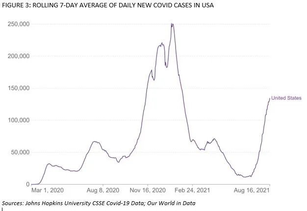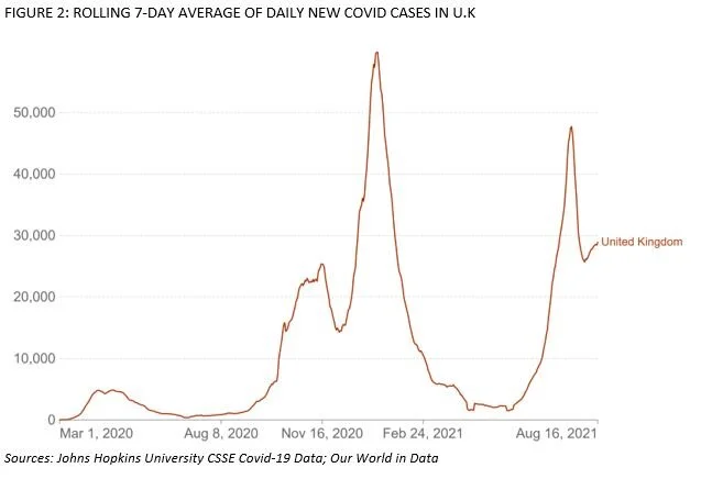 This hopeful line of reasoning appears to have been challenged by the most recent epidemiological data from the U.K. The daily case number did indeed consistently decline after mid-July – though at a lower rate than in India – and so the reassuring words from our experts seemed to be borne out by the statistics. Even Wall Street noticed. Some strategists recommended rotating back into the recovery stocks based on what appeared to be a rapid decline in Covid cases in the U.K.